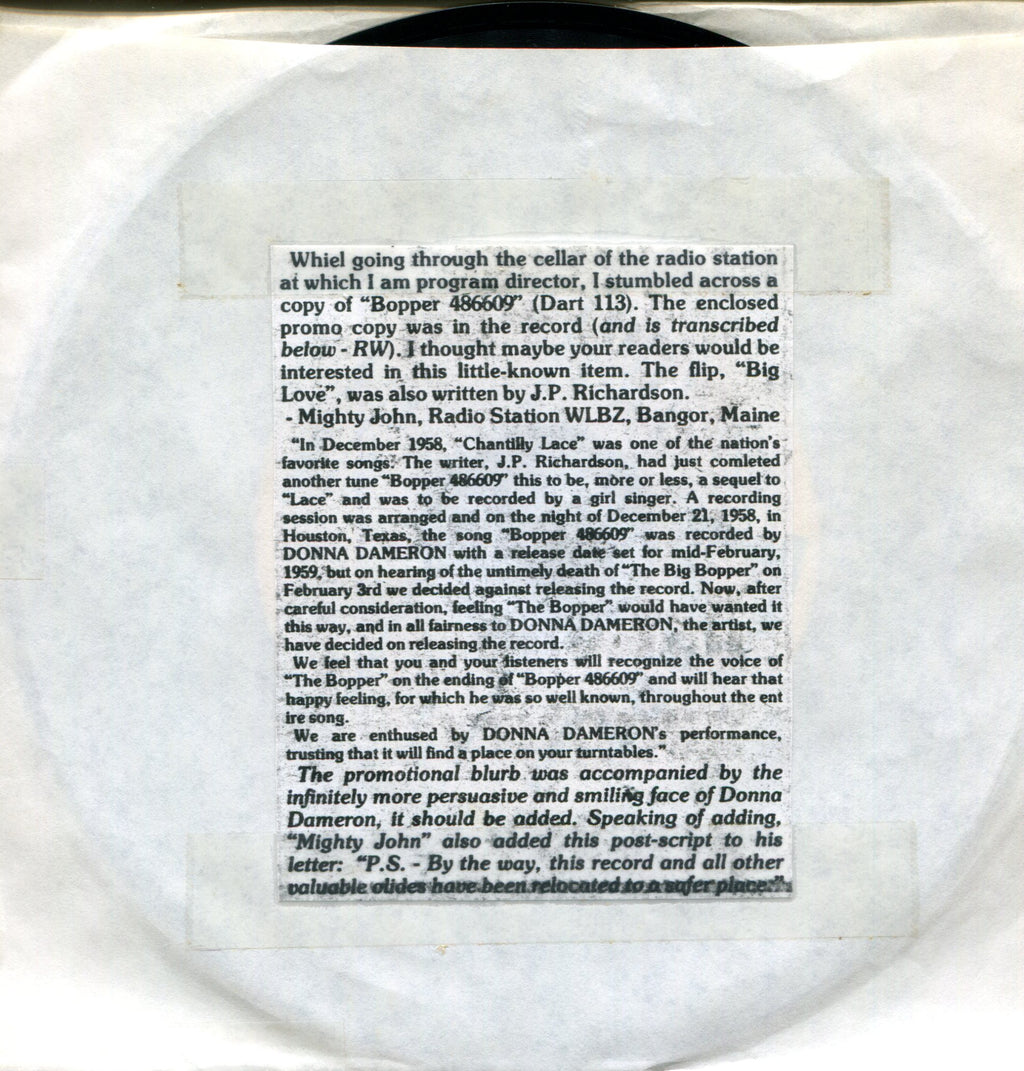 NOTES: Writing on labels. Previous owner attached a photo of Donna Dameron and a photocopied article about the record to a generic white sleeve.